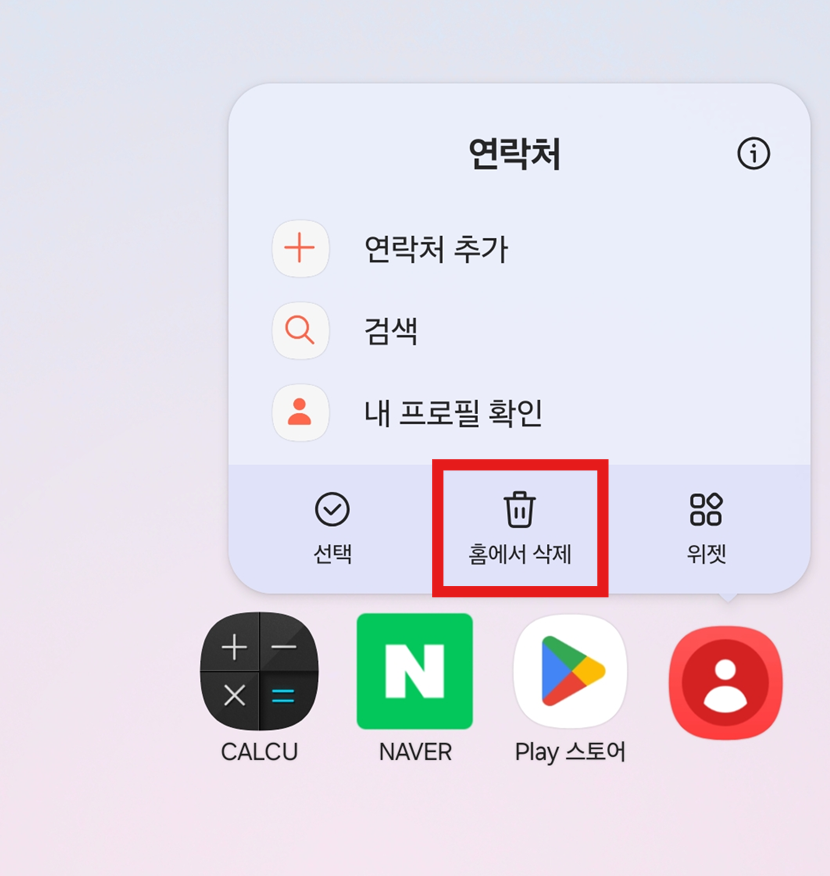 앱을 길게 누르면 여러 가지 메뉴가 나타나요. 여기서 '홈에서 삭제'라는 메뉴를 찾아서 눌러주세요.